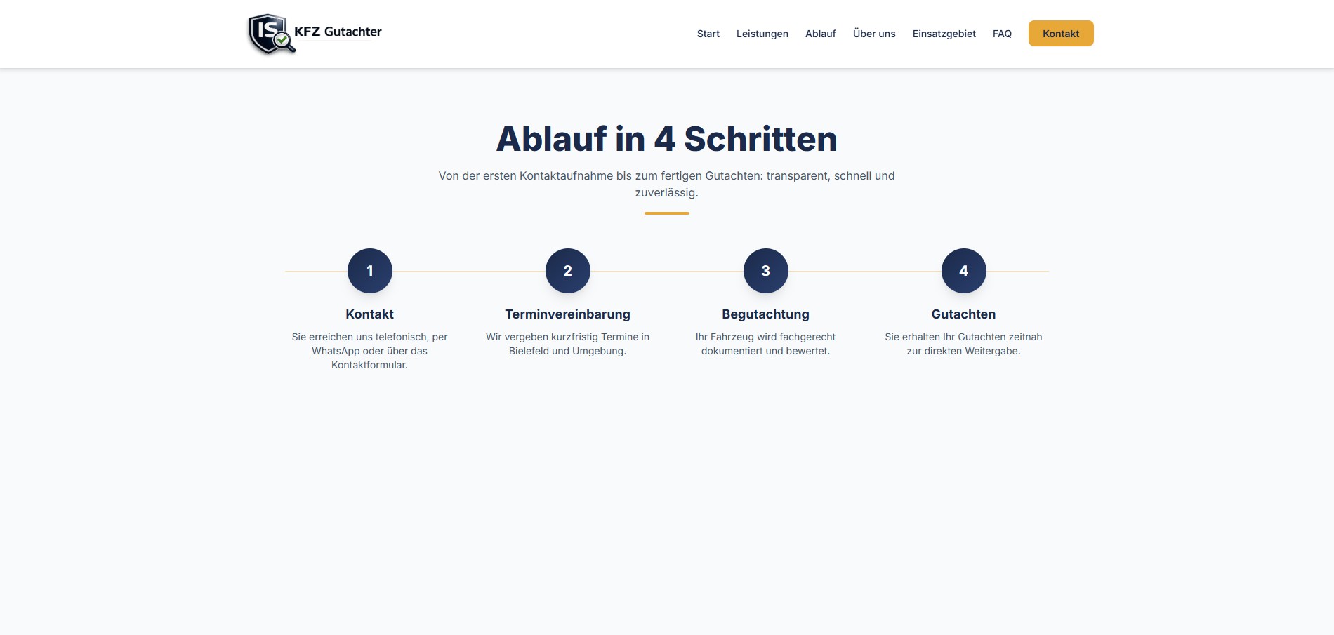 Für den KFZ-Sachverständigen Seckin Is aus Bielefeld wurde eine vollständige professionelle Internetpräsenz von Grund auf entwickelt. Der Kunde benötigte eine moderne, vertrauenswürdige Online-Präsenz, die seine Dienstleistungen klar kommuniziert und potenzielle Kunden direkt zur Kontaktaufnahme bewegt.