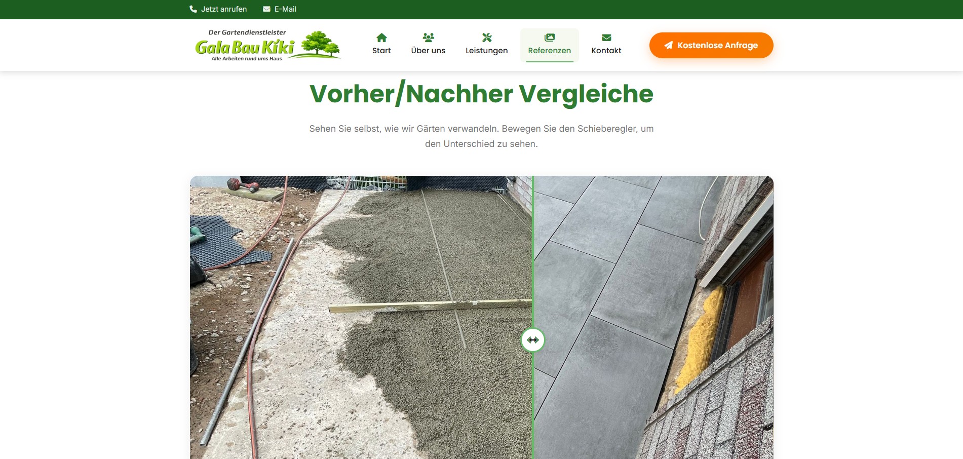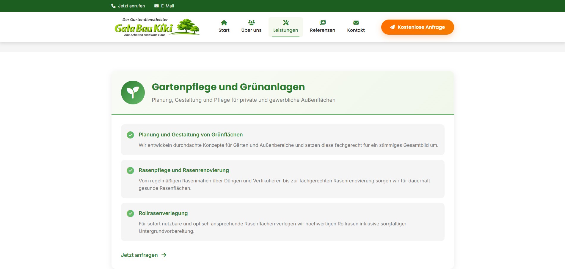 Gemeinsam haben wir eine professionelle Online-Präsenz geschaffen, die das Unternehmen und seine vielfältigen Leistungen ins beste Licht rückt. Von der Gartenpflege über Pflasterarbeiten bis hin zu Baumfällungen und Hochdruckreinigung – Besucher sehen sofort, was GaLa-Bau Kiki anbietet.